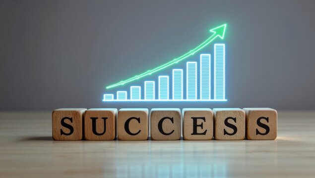 Showcasing business growth with wooden cubes spelling success and a glowing holographic bar chart on a table in a minimalist environment