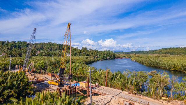 construction and reconstruction of a river bridge on a tropical island in the Philippines, drone view
