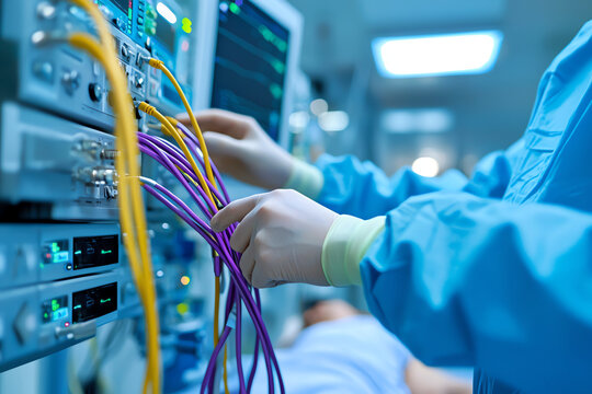 recovery ICU intensive care unit room ward with life support at hospital medical care emergency, biometrics and urgent monitoring of patient health care service banner with copy space