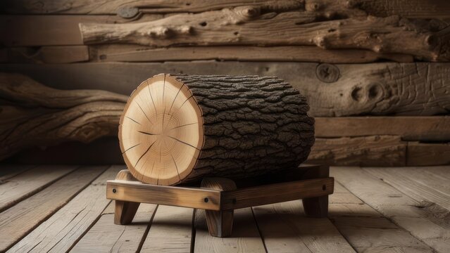 Rustic log resting on a wooden stand.  A weathered log, sectioned, sits on a simple wooden stand in a rustic wooden room.  Warm lighting emphasizes the natural textures