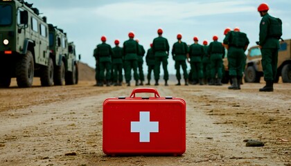 a red first aid kit sits in the foreground with a line of soldiers wearing orange berets and military vehicles blurred in the background.