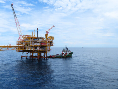 Supply boat transfer the cargo for supporting oil and gas industry and moving cargo from the boat to the platform. Boat is waiting transfer cargo and crews to platform.