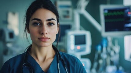 A young female nurse stands confidently in a hospital setting, showcasing her dedication to patient care with modern medical equipment in the background.