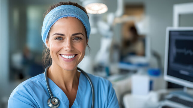 Smiling female nurse in blue scrubs and headband in clinical setting, supportive and calm