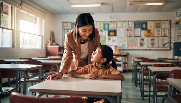 A joyful teacher wearing glasses engages warmly with children in a vibrant classroom, creating an inspiring and supportive environment filled with energy and learning.
