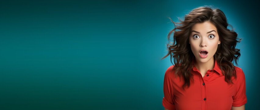 Portrait of a suprised or shocked young woman, open mouth and wide opened eyes, brunette  hair, blue background