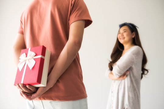 Boyfriend embracing and giving his girlfriend a heart shaped box gift to celebrate Valentines Day. Young couple holding a suprise present on their relationship anniversary. Love and romance date. High