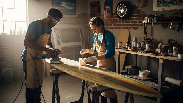 Caucasian craftspersons crafting surfboard in workshop environment