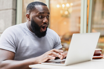 Impressed shocked surprised african-american businessman student freelancer using laptop, watching comedy, reading news, surfing Internet social media online in city cafe outdoors.
