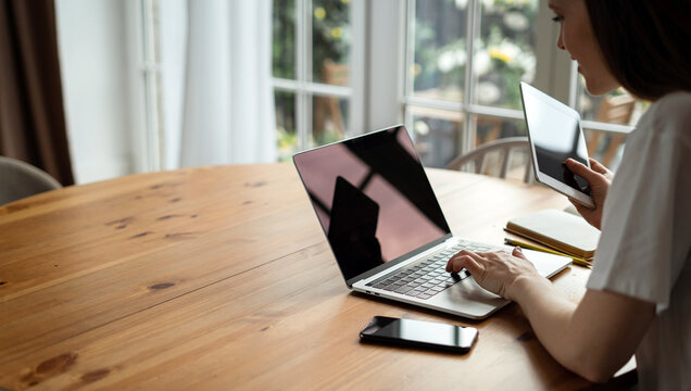 Business woman using digital tablet and working on laptop computer on wooden table at coffee shop. Student studying online, searching the information, surfing the internet at cafe