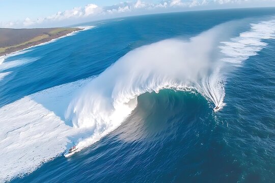 Single perfect wave in blue deep dangerous ocean - perfect barrel for brave surfers - coast in background for touristic scenic place - enjoy the beauty of the world and the feeling of the sea