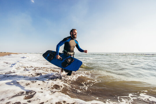Senior female surfer with surfboard walking into ocean waves on sunny day