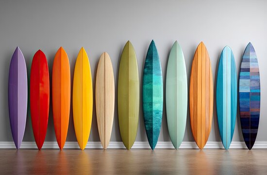 Colorful Surfboards Display a Spectrum of Hues, Ready for Ocean Adventures
