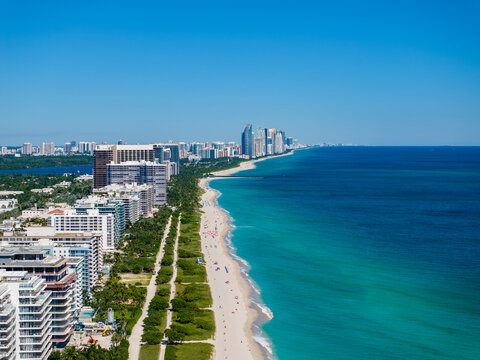 Skyline of Miami Beach from top. Summer in Miami. Miami beach coastline. Panoramic view of Luxury condos in Miami Beach Florida. Aerial View of Surfside Miami Beach.