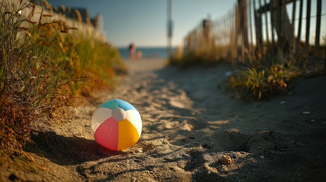 Multicolored beach ball rolls gently down golden sandy dune at sunset