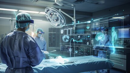 Surgeons in a high-tech operating room using advanced AI and virtual reality interfaces for a precision-led surgery, with digital data overlays and monitoring screens.