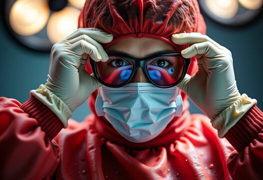 Close up of a determined female surgeon in blue scrubs and mask, preparing for surgery under bright operating room lights, showcasing medical expertise