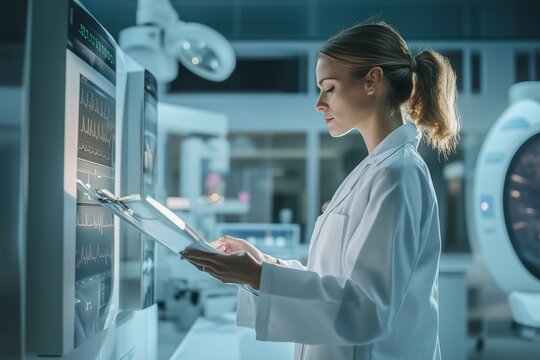 Female doctor analyzing medical data on a digital tablet, standing next to a modern ultrasound machine in a hospital room