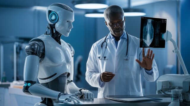 Medical robot showing x ray to doctor in futuristic hospital operating room