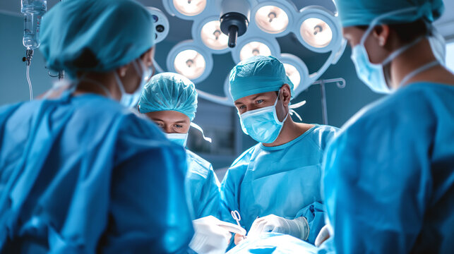 Surgeons performing an operation under bright lights in an operating room, demonstrating teamwork and precision in a high-stakes environment.