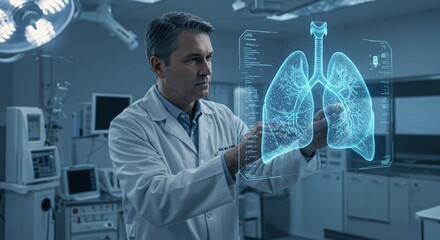 Man doctor using holographic lung scan in operating room to diagnose respiratory disease, showcasing medical technology for pulmonology clinic or science research.