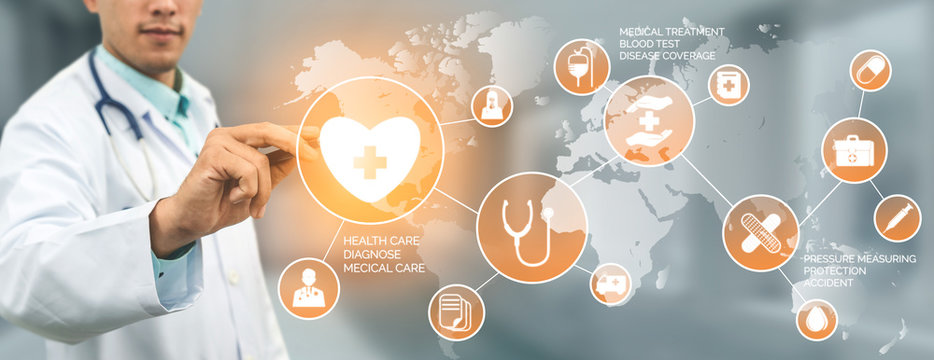 Medical Healthcare Concept - Doctor in hospital with digital medical icons graphic banner showing symbol of medicine, medical care people, emergency service network, doctor data of patient health.