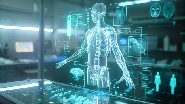 holographic medical table with digital data and an AI interface, showcasing the integration of technology in the analysis of human anatomy for future medicine in a futuristic lab environment