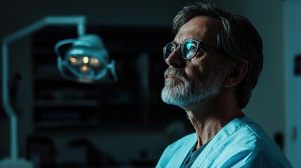 A male doctor in a blue uniform, wearing glasses, standing in a dimly lit operating room with a surgical light above him.