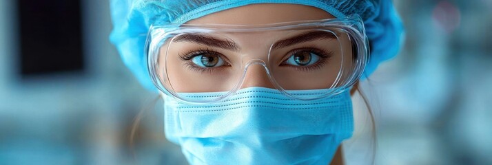 Close-up of a healthcare worker wearing a blue surgical mask, protective goggles, and a hairnet with focused and determined eyes