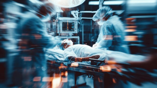 Surgeons Perform Laparoscopy in Operating Room With Blurred Focus on Patient and Medical Equipment Present During Surgery