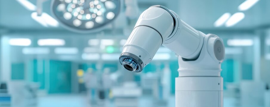 A robotic arm in a clinical setting, showcasing advanced technology in surgery or healthcare environments.