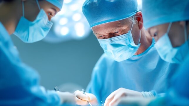 Surgeons in blue surgical gowns and masks performing an operation with focused precision in a sterile operating room environment