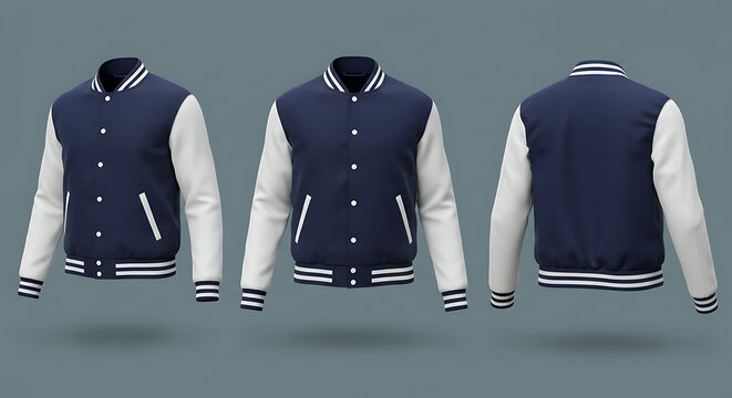 Set of black Oversized Baseball Bomber varsity jacket with ribbed strip elastic hem, front back side view on transparent background cutout, PNG file. Mockup template for artwork design.