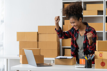 SME business owner African American female entrepreneur Checking orders and checking the number of parcels delivered online to customers who exceeded the target order. business startup ideas.