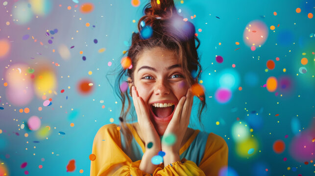 Cheerful young woman posing in surprise around confetti on blue background. Concept of holiday, fun.