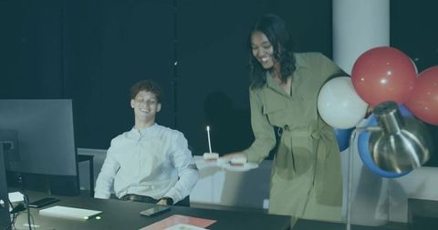 Colleague birthday surprise with cake and balloons in office