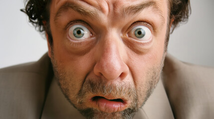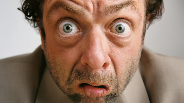 Man with a surprised and confused expression, eyes wide open and mouth slightly agape. The background is neutral, focusing on his exaggerated facial expression.