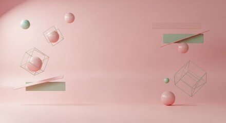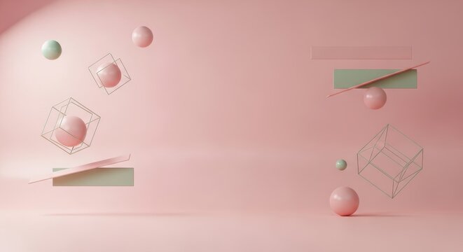 Abstract Geometric Composition with Floating Spheres and Rectangles in Pastel Tones
