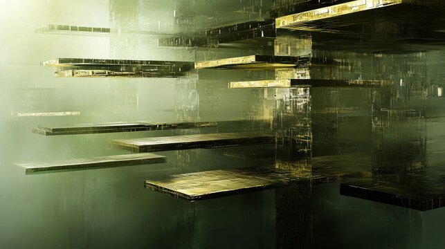 Abstract golden platforms in a hazy environment