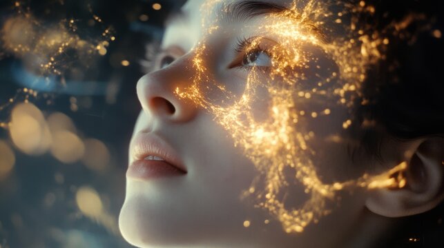 A dreamy face glows with golden light trails, connecting thoughts to stars, evoking wonder and cosmic curiosity.
