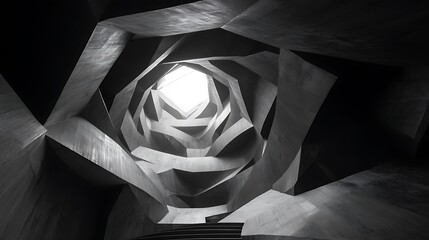 A monumental structure where walls defy gravity, twisting and folding upwards toward a singular point of light, surreal sci-fi architecture,