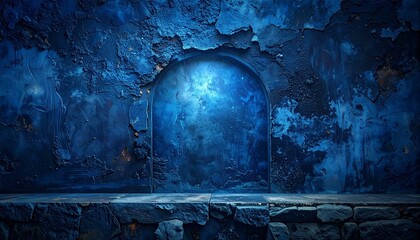 Surreal blue-toned mountain landscape with jagged peaks under a moody sky and swirling clouds.