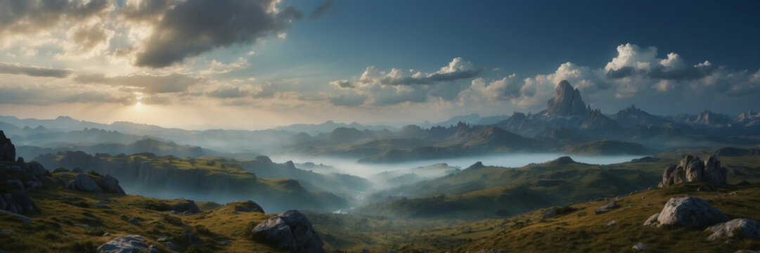 Majestic Mountain Range Under a Dramatic Sky With Vibrant Clouds During Sunset in a Surreal Landscape