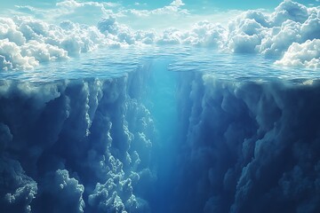 A surreal landscape where the sky is made of water and the ocean is above, defying the natural order and creating a dreamlike, inverted world