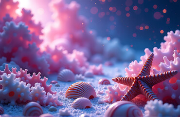 surreal seascape unfolds ethereal haze ocean treasures seashells starfish coral suspended amidst