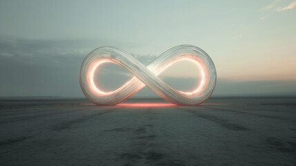 Architectural composition on surreal landscape with water. Gate, glossy portal with empty podium. 3d render illustration. Pedestal with abstract glass, mirror shapes and nature sand