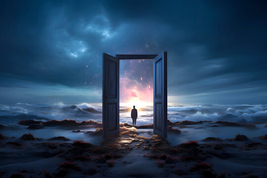 A silhouetted figure stands in front of a glowing portal amidst a surreal sky, symbolizing innovation and future exploration.