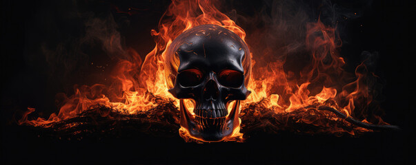 Flaming skull with crack detail on black