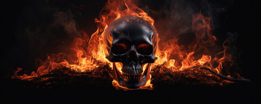 Fiery skull with flames emanating from eyes in dark setting