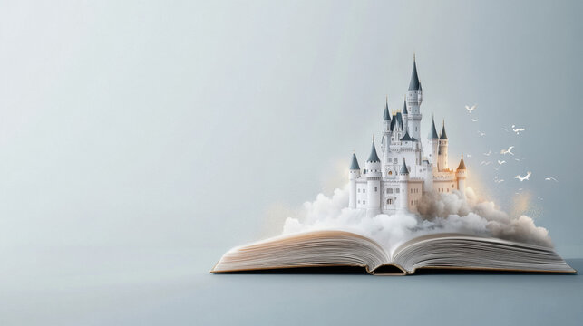 Castle emerging from an open book, refracting light into soft prismatic hues, showcasing ancient historical stories